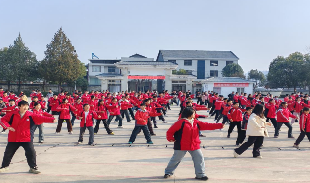作为武当文化辐射区,房县化龙学校积极响应“武当武术进校园”的推广号召,结合校园素质教育需求,将简化后的武当武术套路融入大课间活动。活动中,体育教师化身专业教练,从抱拳礼等基础礼仪教起,逐一拆解手型、步型等核心动作,耐心纠正师生们的姿势与发力方式,让大家在练习中体会“以意导气、以气运身”的内在韵味。老师们与学生们并肩列队,一招一式认真揣摩,时而舒展如行云流水,时而沉稳如劲松挺拔;同学们精神饱满、眼神专注,在反复练习中逐渐掌握动作要领,稚嫩的招式里透着刚健之气,校园操场处处洋溢着传统文化的鲜活气息。