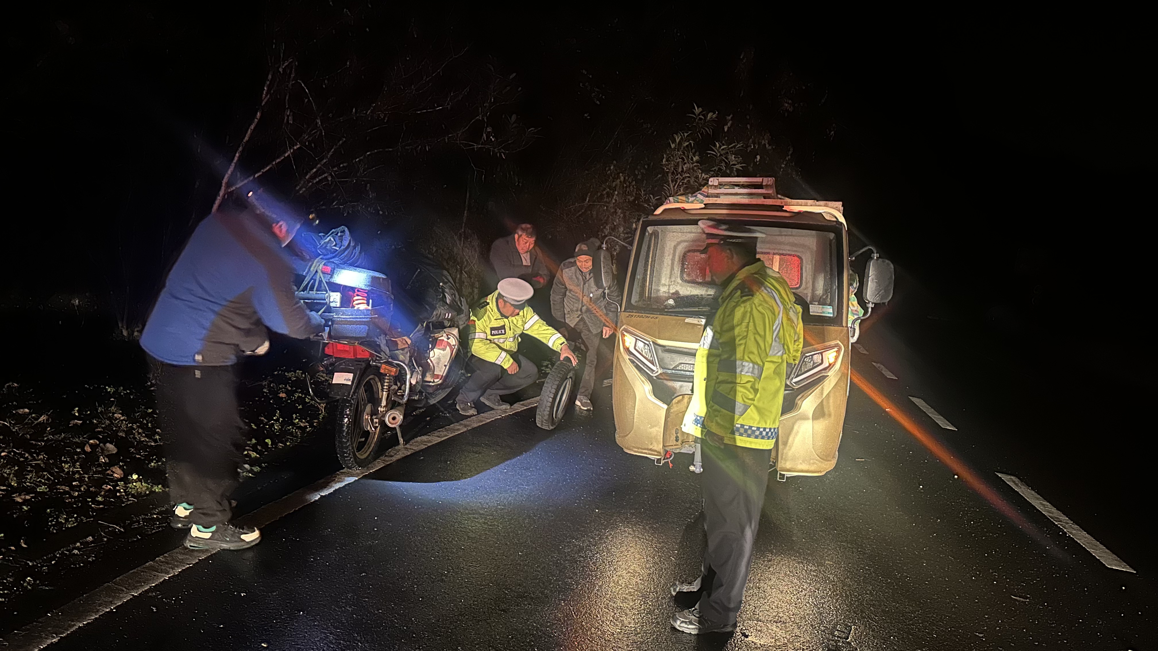 巡逻车辆行驶至(G209国道)野人谷镇野人湖路段,发现一辆三轮摩托车停放在弯道内,两名衣着深色外套的老年人站在车的两旁,民警通过询问情况,发现车辆右侧轮胎爆胎,发生抛锚,巡逻民警便迅速配合司机代某,将车辆推至路旁的应急车道内,协助其换好备用轮胎,消除安全隐患,切实保障人民群众的生命财产安全,提高满意度。