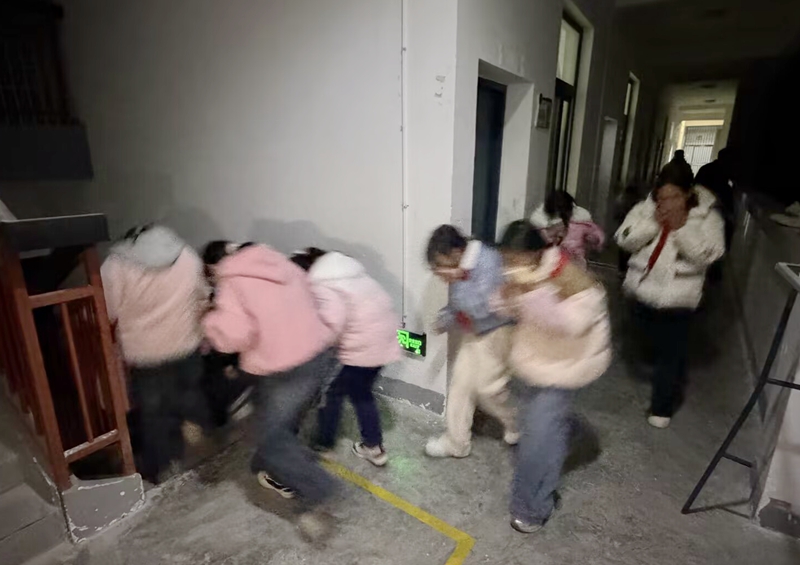 随着警报声响起,消防应急疏散演练正式拉开帷幕。各班级教师迅速组织学生按照预定路线,弯腰低姿、捂住口鼻,快速有序地撤离至寝室楼前安全区域。整个疏散过程紧张有序,未出现拥挤、慌乱等情况,全体师生在规定时间内安全集结。