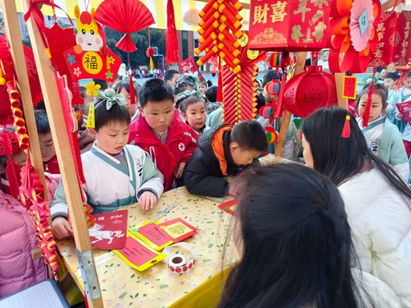 活动现场设置了“福马诵诗迎新年”、“福马算乘解福题”、“福马量尺吟诗篇”、“福马唱词贺新元”及“福马纳福挂心愿”五大关卡。孩子们化身“福马小将”,既要流利吟诵新春诗词,又要通过数诗句行数与字数列出乘法算式,实现了跨学科的巧妙融合。在测量书签长度、吟唱古诗等环节中,学生们动手又动脑,自信满满地赢取“福运星”。最具仪式感的当数最后一关,孩子们将写满寄语的红色书签、灯笼挂在“迎春福马树”上,许下新年愿望。孩子们集齐五颗福运星,获得老师精心准备的新年礼物,脸上洋溢着成功的喜悦。