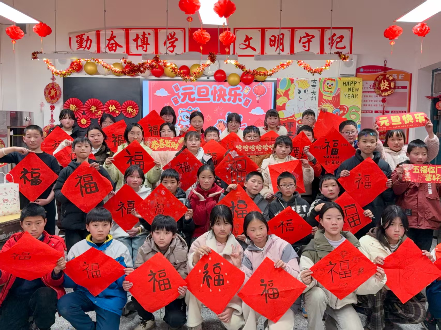 活动当日,家长们携带气球、中国结、手工作品等材料提前到校,与教师分工协作布置教室。大家或绘制新年主题墙面、悬挂装饰,或整理学生作品展示区,用细节营造出浓厚的新年氛围。