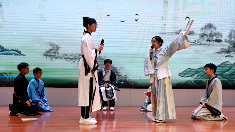 节目“读”“演”融合,大胆创新,搭配传统古装、中式道具,使人身临其境。现场,高一年级以朝气赋经典新韵《孔乙己》《茶馆》等课本剧,演员表演惟妙惟肖,把文学人物的性格与命运演绎得入木三分;《跨越千年遇苏轼》以穿越时空的对话牵起古今共鸣;《破晓》将家国情怀镌刻成新时代少年的印章;《红楼梦》《雷雨》以细腻表演还原作品中的人性与时代,尽显对文学场景的深刻体味。高二年级以厚重积淀文化底蕴《琵琶行》以歌舞织就“江州司马青衫湿”的共情;《屈原列传》活用多媒体勾勒战国风云,沉郁的台词与凝重的表演,将屈原“虽九死其犹未悔”的赤心化作爱国爱家的精神火种;《诗源房陵》《采采其姝,歌动同袍》根植房陵文化沃土,彰显地域文化特色,铿锵的音韵传递出传承出文化自信;《伶官传序》更让“忧劳可以兴国”的爱国之情直抵人心。《诗词歌赋里的中华》《诗画房陵》教师节目串联起从《诗经》到唐诗宋词的经典篇章。
