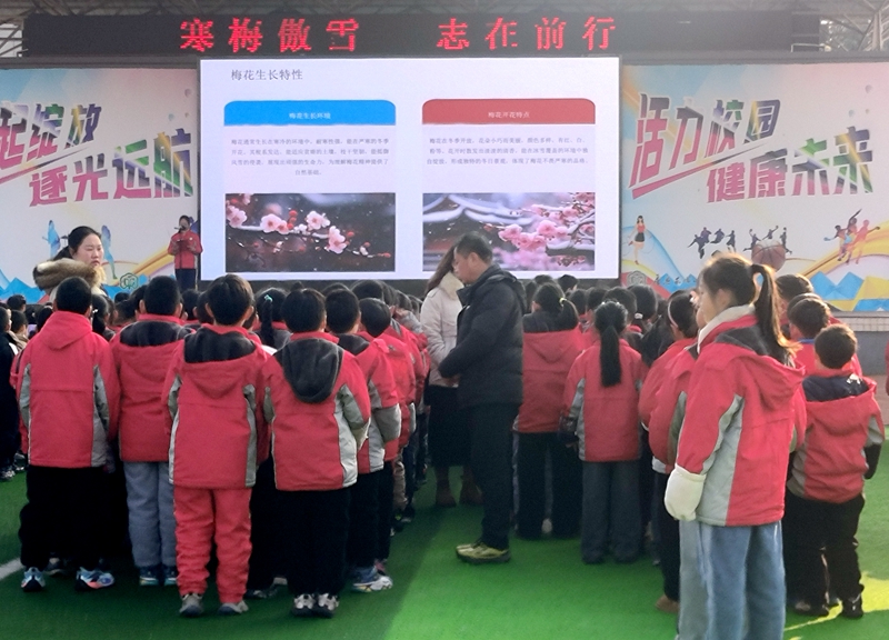 活动现场秩序井然,操场中央的电子大屏图文鲜活、内容翔实,清晰展示梅花品种特质与生长习性,重点阐释梅花未逢花期,却不惧凛冬寒意、深扎根土、默默蓄势的生长本色,生动诠释其不畏风霜、坚韧不拔的精神内核,让孩子们直观体悟梅花傲雪而立的可贵品格,大家凝神驻足、专注聆听,沉浸式感受梅之风骨。