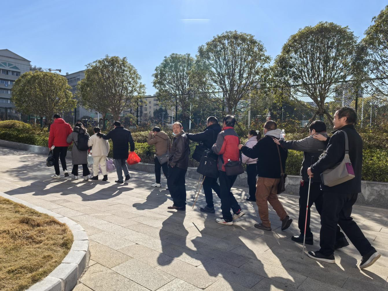 筹备阶段,学校对标省、县“五个一”(读一本书、看一次电影、游一次园、参观一次展览、参加一次文化活动)活动要求,调研盲人群体精神文化需求与出行顾虑,联合湖北医药学院规划无障碍路线、排查设施,并组建专业陪护队伍。活动当天,志愿者与工作人员“一对一”全程陪护,引导盲人沿盲道漫步校园,志愿者细致讲解校园历史、建筑布局、学科特色等内容。盲友们沿途交流技能培训收获,畅谈对校园生活的憧憬,现场氛围温馨热烈。盲人学员表示李某:“走出家门参与活动,既感受到无障碍环境的便捷,也体会到社会关怀,更坚定了我们靠技能立足、融入社会的决心。”