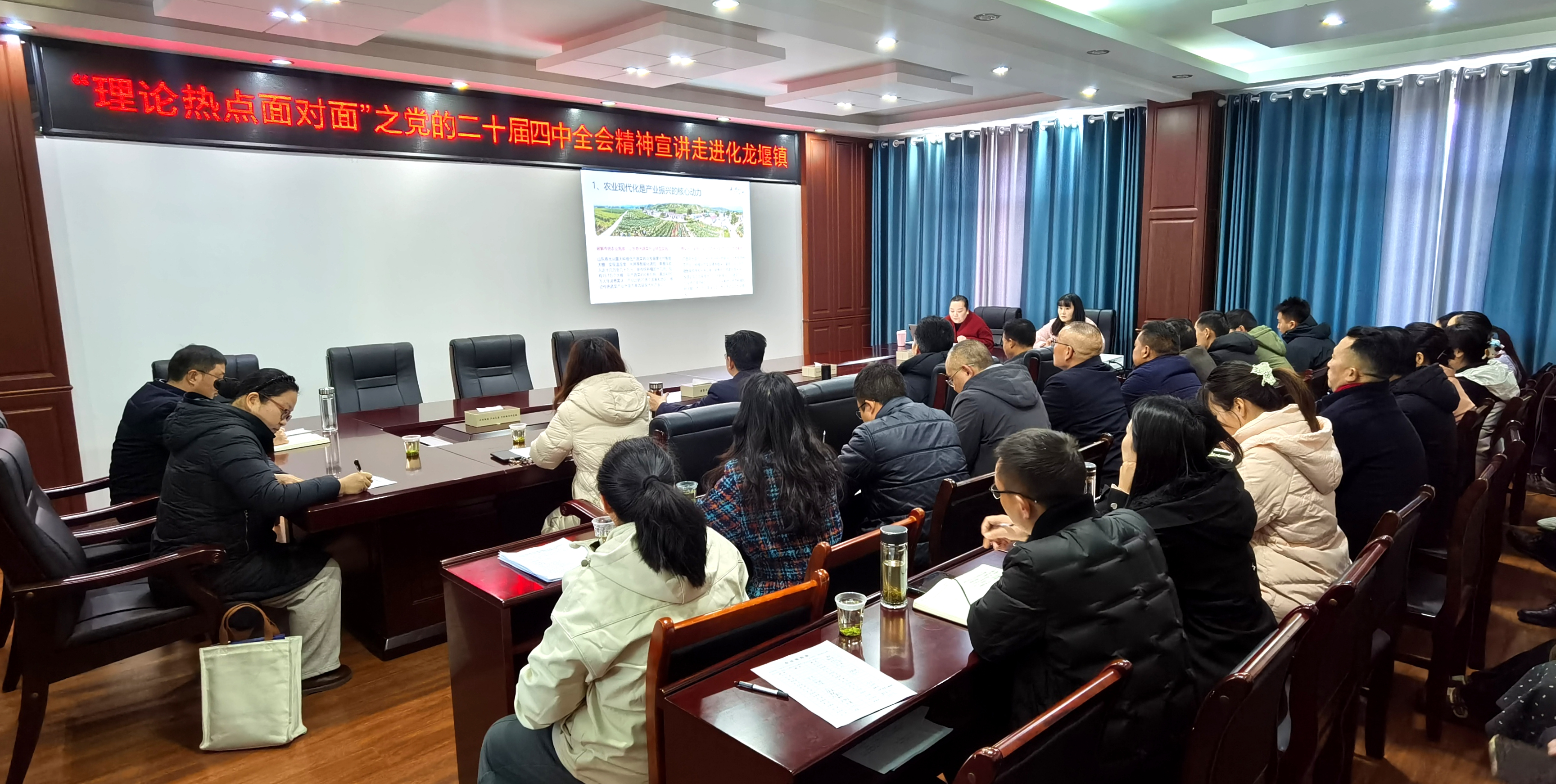 在化龙堰镇,宣讲队为全体机关干部、村党支部书记等授课,“以农业现代化之笔,绘就乡村全面振兴新图景”为主题,紧扣党的二十届四中全会关于全面推进乡村振兴的战略部署,结合化龙堰镇发展实际,对如何以农业现代化引领乡村产业、人才、文化、生态、组织等进行了系统阐述和深入解读。宣讲内容既有理论高度,又贴近地方实际,为基层党员干部群众深刻领会、准确把握全会精神提供了有力指导。