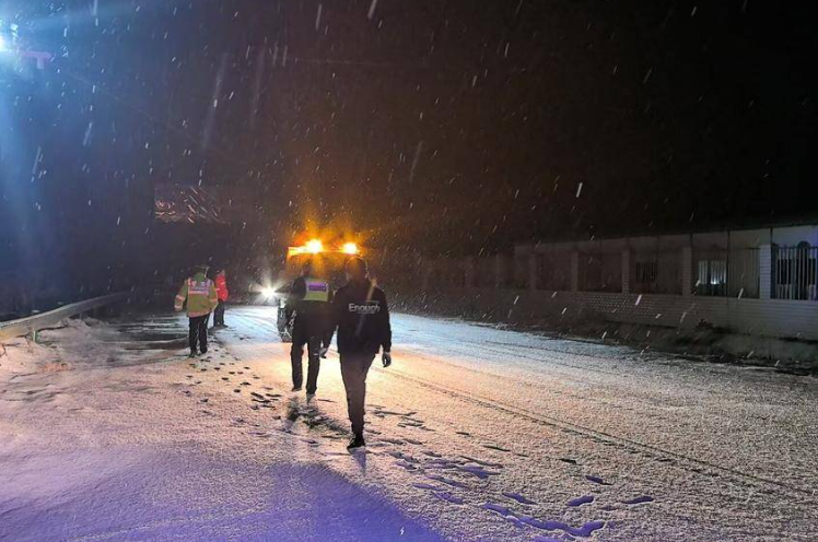 风雪夜巡,铺就安全出行“防滑毯”。降雪伊始,安全先行。19日夜间,镇应急办、派出所与交管四中队民辅警顶风冒雪,连夜对辖区主要道路、桥梁、陡坡急弯等易结冰、易发生事故的重点路段开展全方位巡查,及时排查道路积雪结冰情况,第一时间在危险路段设置警示标志,并积极协调路政部门,在关键点位科学投放融雪剂,全力预防道路结冰。