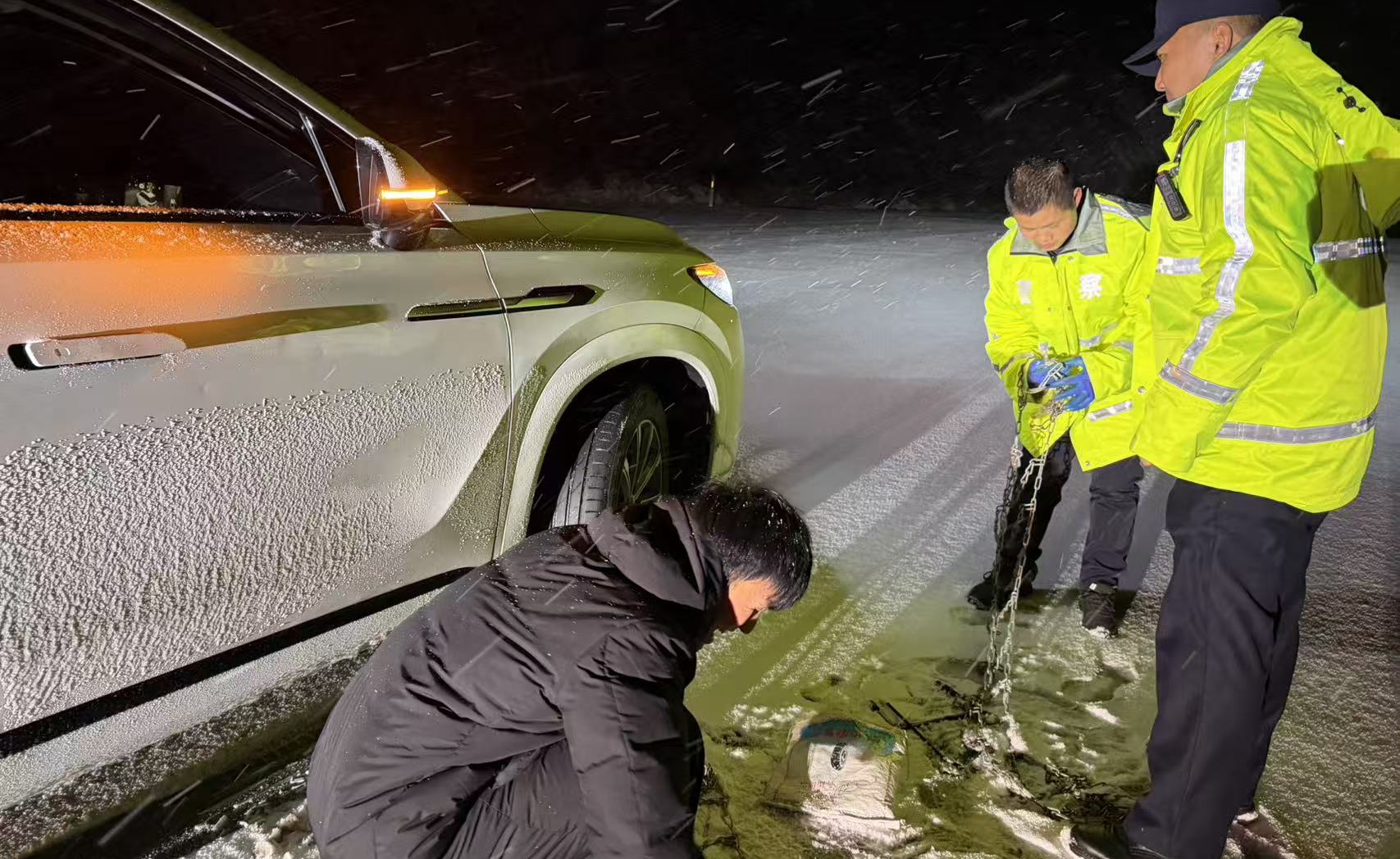 在346国道石垭子路段,窑淮派出所民辅警巡逻防控时发现一名群众因路面积雪导致车辆受困。民警立即上前协助,为其安装防滑链,帮助其安全脱困。