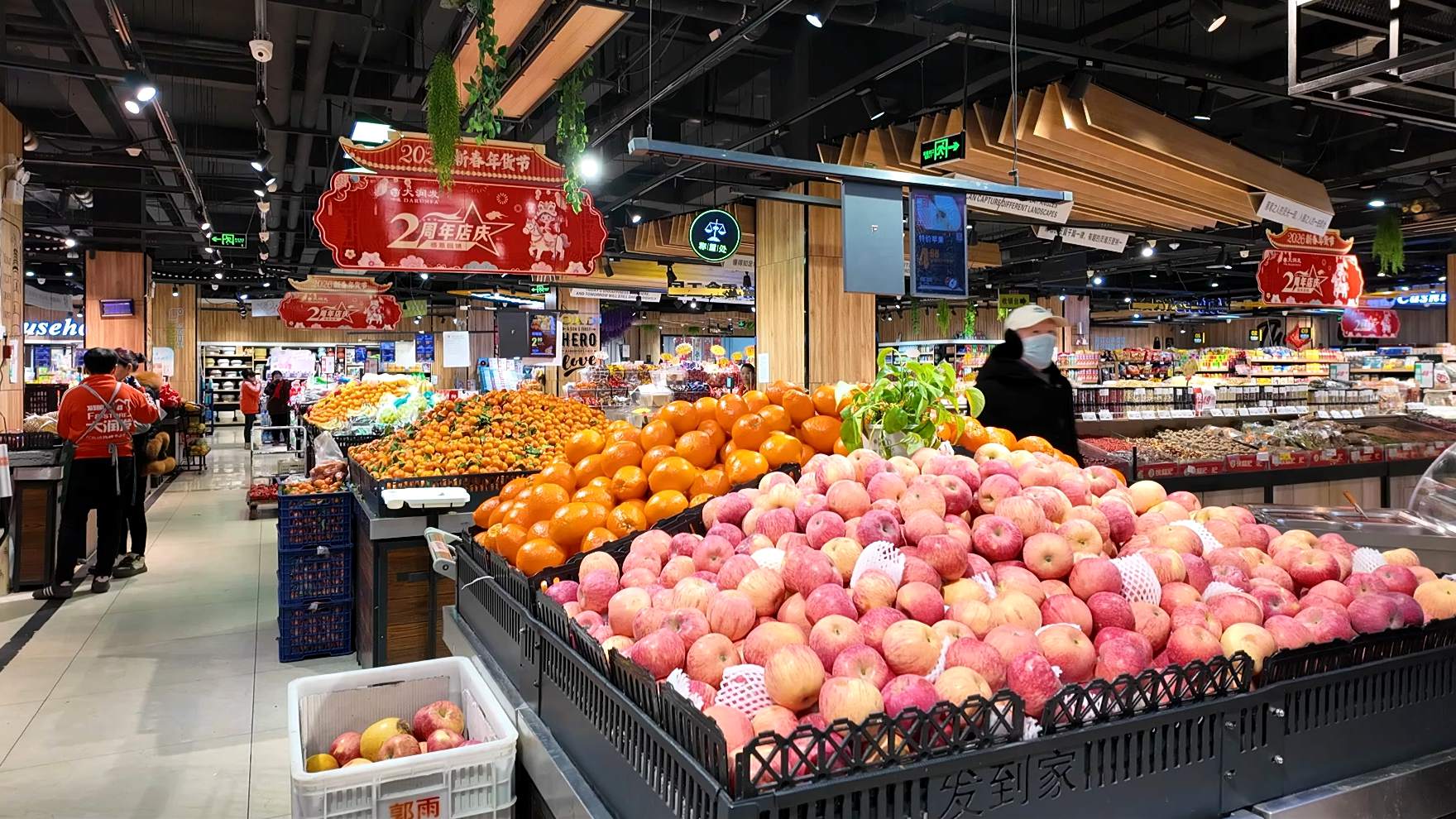 1月20日上午,记者在大润发超市新时代店看到,粮油米面、蔬菜水果、肉禽蛋奶等货架丰满、品类齐全,市民在货柜前驻足选购。