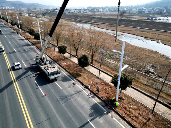 在项目施工现场,工人们正紧张有序地进行灯杆组装、线路铺设和设备调试等工作。该项目经理祁正明介绍:“军店至塘溪一级路的路灯安装,我们正在加班加点,现在已经完成了200多盏,在春节前,靠南边的320盏路灯将全部完工,为群众出行带来有亮、方便。”