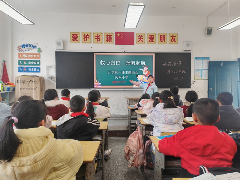 房县新闻网讯 通讯员 叶盛煜 报道:为帮助学生快速调整状态,收心归位、凝心聚力,以积极饱满的精神面貌迎接新学期,3月6日,门古寺镇河兴小学组织各班召开“收心归位 扬帆起航”开学第一课主题班会。