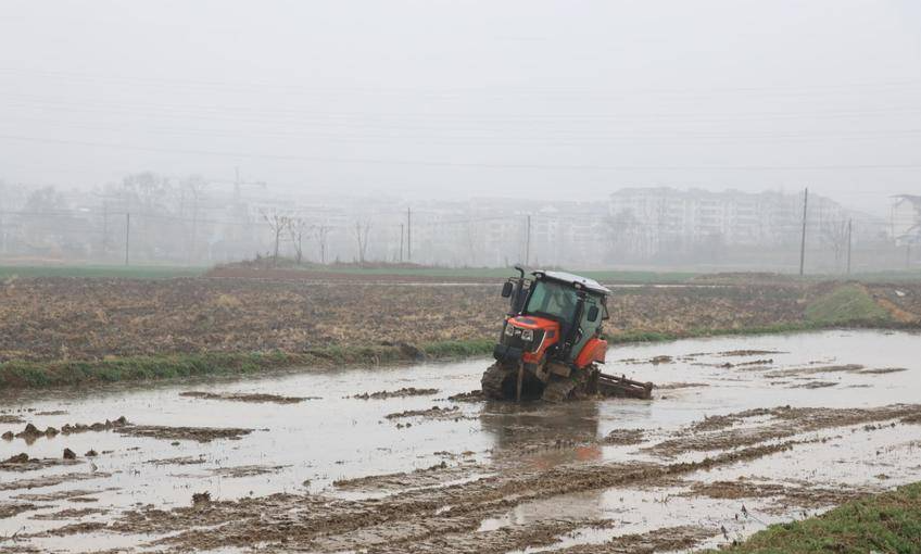 而在相邻的田地里上演着另一番繁忙景象。伴随着拖拉机的轰鸣声,一台履带式拖拉机在灌满水的稻田里来回穿梭,翻耕土地、搅拌泥浆,把原本板结的田块整理得平整软烂,为接下来的水稻育秧做好准备。