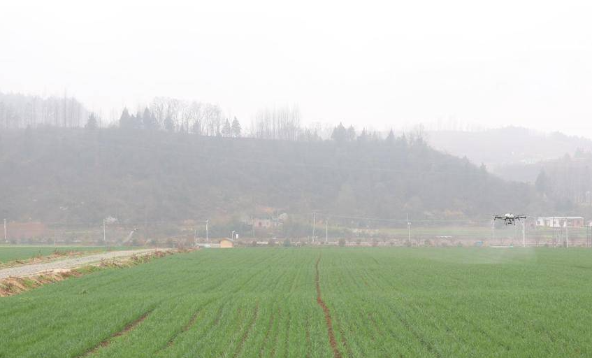在军店镇中村村的小麦种植基地里,植保无人机正低空掠过麦田,均匀地喷洒着叶面肥和病虫害防治药剂,短短十几分钟就完成了十几亩地的飞防作业。
