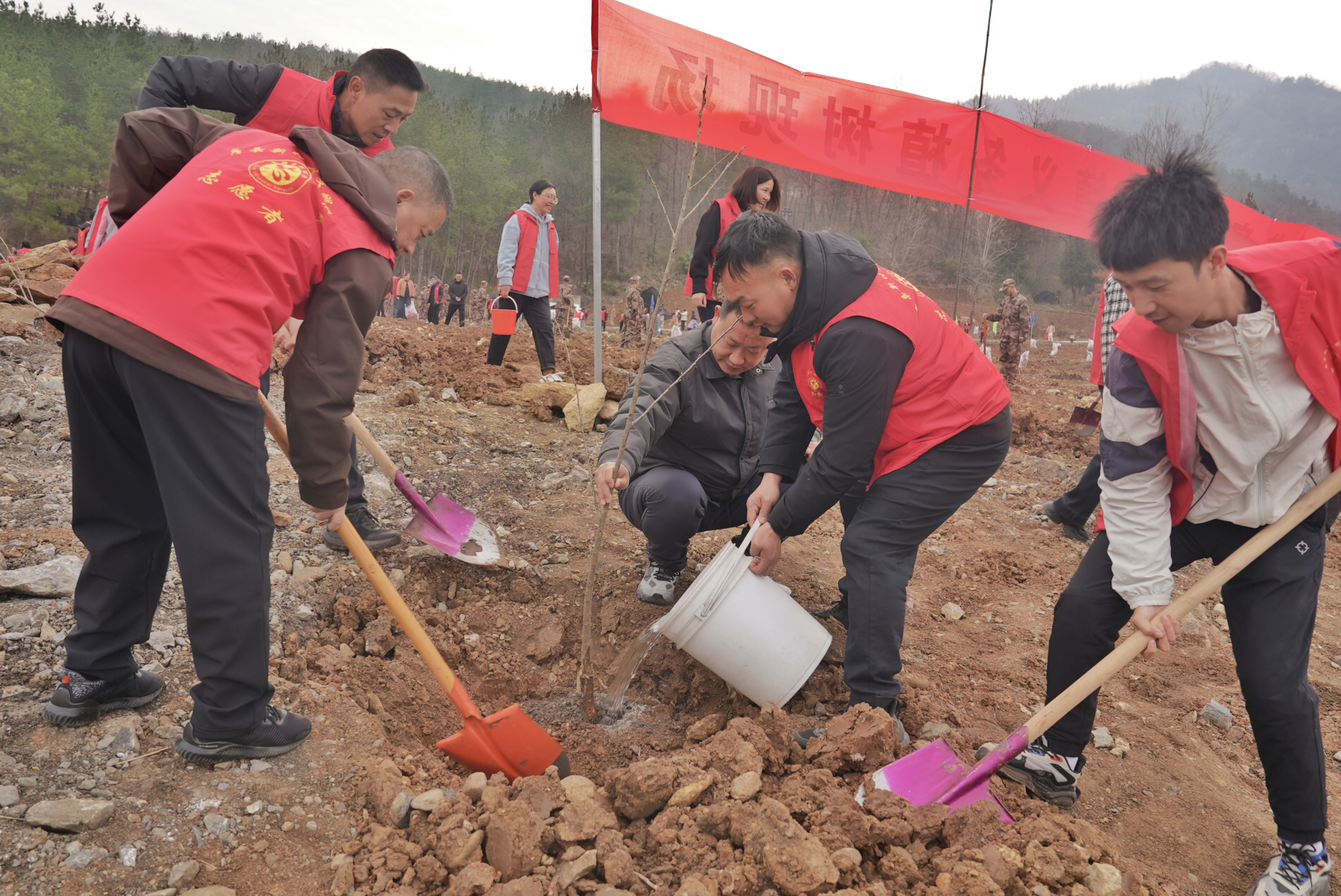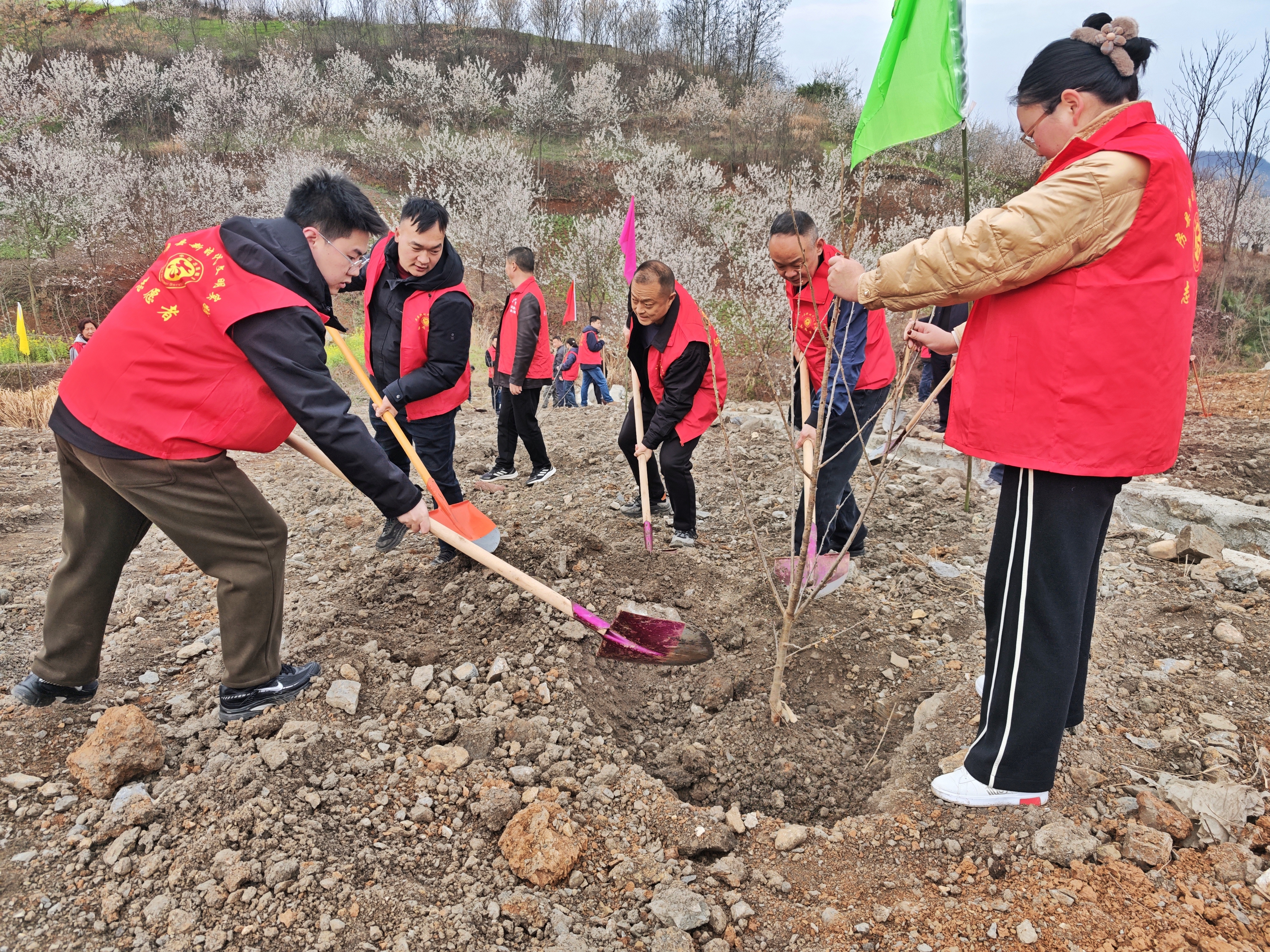 活动现场位于炳公村规划绿化区域,一面面鲜艳的志愿服务旗帜迎风招展,身着“红马甲”的志愿者们热情高涨,与盎然春意交相辉映,构成了一幅生机勃勃的劳动画卷。尽管晨风微凉,但植树现场却是一派热火朝天的繁忙景象。大家三五人结成“植树搭子”,分工协作,默契配合。挥锹铲土、扶苗填坑、提水浇灌……每一道工序都一丝不苟,现场还不时传来技术人员“三埋两踩一提苗”的细致指导声,确保栽一棵活一棵,植一片绿一方。