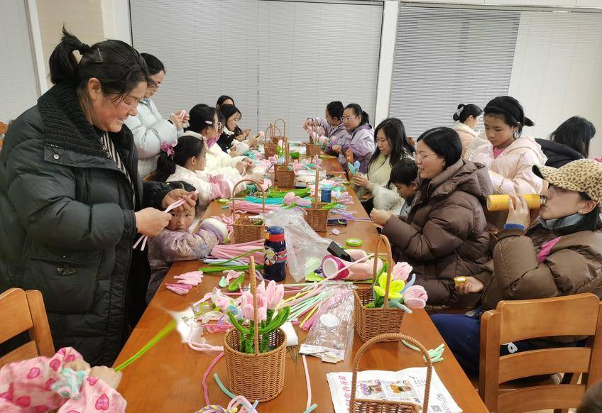 进入实操环节,妈妈们纷纷化身“手工达人”。彩色的扭扭棒在指尖灵活穿梭,一扭一捏、一卷一折,一朵朵娇艳欲滴的郁金香渐次绽放。孩子们则在一旁当起得力助手,有的帮忙递送材料,有的认真研究配色,有的负责为妈妈的作品“点赞”。