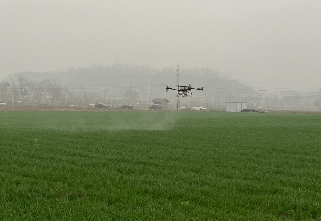 走进军店镇中村的麦田示范区,伴随着螺旋桨的嗡鸣声,一架架满载高效低毒农药的植保无人机在技术人员的操控下腾空而起。它们沿着预先设定的航线匀速飞行,机身下喷出的雾化药液如丝如缕,均匀洒落,为成片正在拔节生长的麦苗披上了一层薄薄的“防护纱衣”。