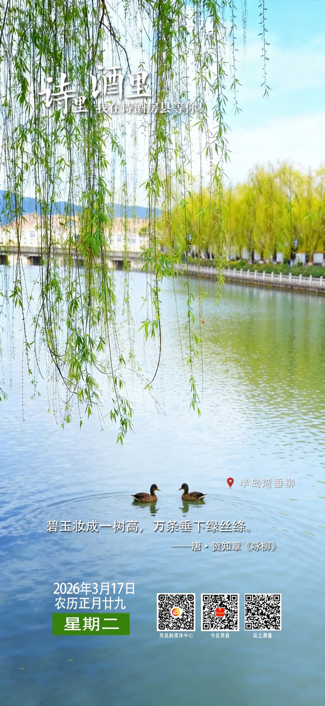 【诗里 酒里 我在诗酒房县等你】半岛湾垂柳 2026-03-18 17:01 0 马栏河 U 型半岛水湾自古就是城邑临水要地,柳树因耐水湿、固堤护岸,历代均有种植,民间有 “庐陵王植柳拴马”“尹吉甫插柳辨路” 的传说。 (责任编辑:邹怡)