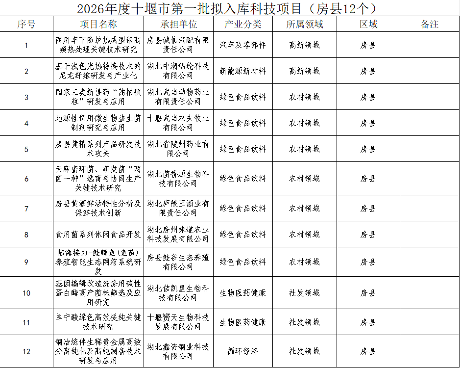 为充分发挥科技创新支撑引领作用,全力服务“品”字型产业矩阵发展需求,推动科技创新和产业创新深度融合,根据《关于印发〈十堰市科技项目库建设方案〉的通知》有关要求,经广泛发动、公开遴选,现将2026年度十堰市第一批拟入库科技项目予以公示。公示期为2026年4月1日至2026年4月8日。