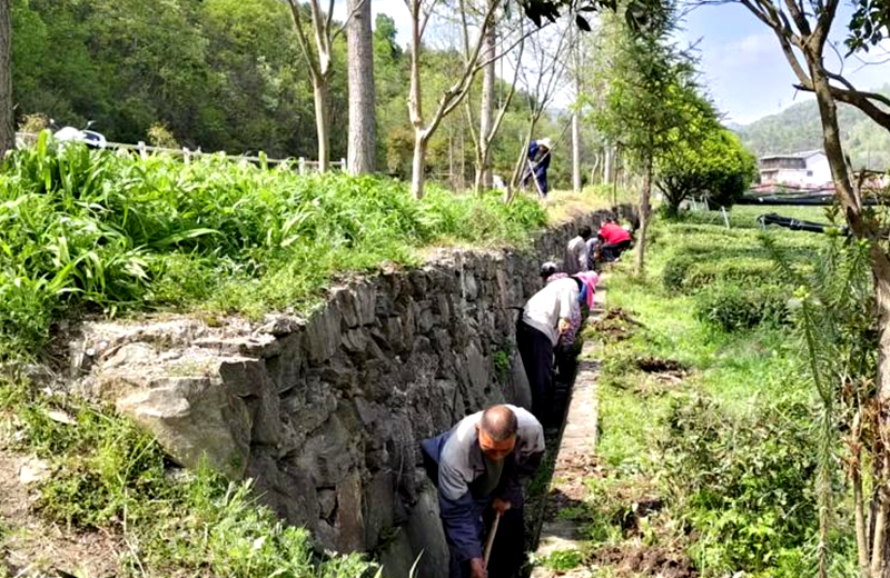 茶园旁,长长的沟渠边人头攒动。村民分工明确、配合默契。手持铁锹、锄头弯腰清理淤泥、杂草与石块;徒手捡拾垃圾、疏通堵塞;还有人清运杂物、平整边坡。大家不怕脏累,挥汗如雨,原本堵塞的沟渠逐渐畅通整洁。