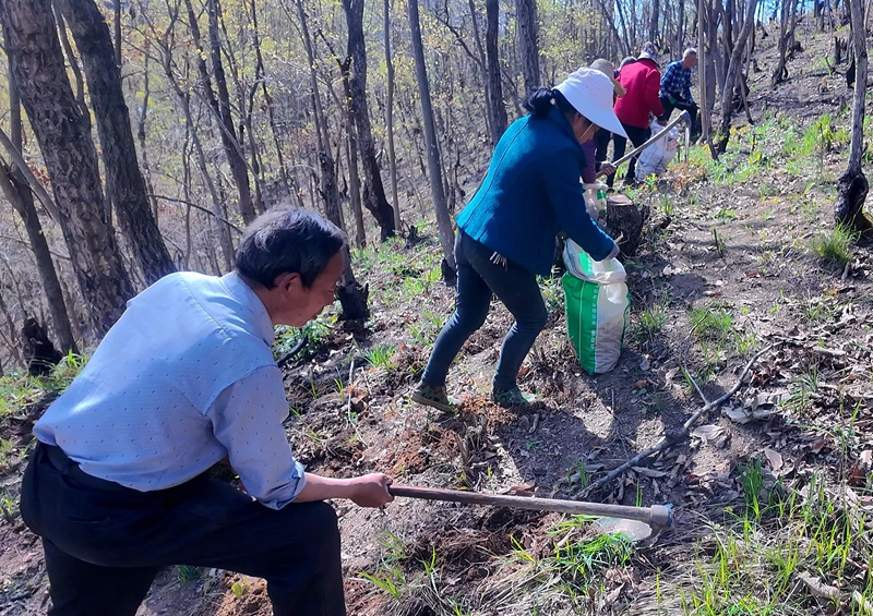 春风拂林,锄落土翻。近日,记者在窑淮镇淮水村黄精种植基地看到,松针落叶铺满林地,20多名村民正弯腰劳作,有的挥锄挖窝,有的细心下种,有的覆土压实,分工有序。