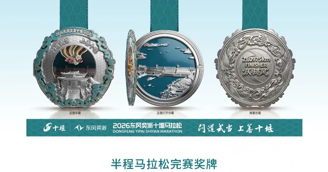 完赛奖牌以武当太极圆为外形,采用双层镂空翻盖结构,融合武当金顶、丹江口大坝、东风汽车标志等元素,实现“一牌藏三景,开合见十堰”,马拉松、半程马拉松奖牌分别为金、银色,成为兼具收藏与纪念价值的文化载体。
