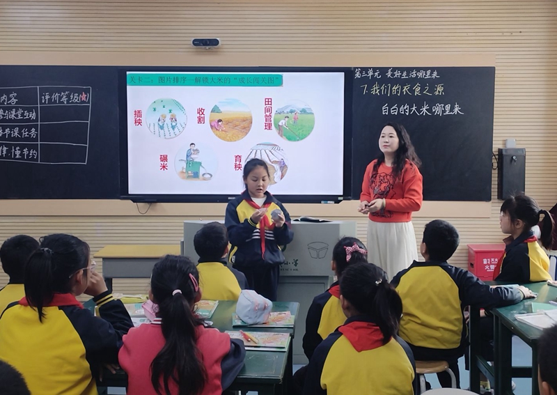 四年级课堂上,冀曼老师以“美好生活探秘营”为大情境,带领学生从河姆渡碳化稻种追溯大米“前世”,通过图片排序梳理水稻生长周期,并组织“模拟插秧”“手工脱粒”等体验环节,让学生在汗水中体会“粒粒皆辛苦”。课堂还结合传统农耕与无人机播种等现代农业技术,融入袁隆平院士事迹、《悯农》诵读及校园浪费现象反思,将珍惜粮食的美德深植心田。课后设计“光盘行动打卡”等任务,推动劳动教育延伸至生活。