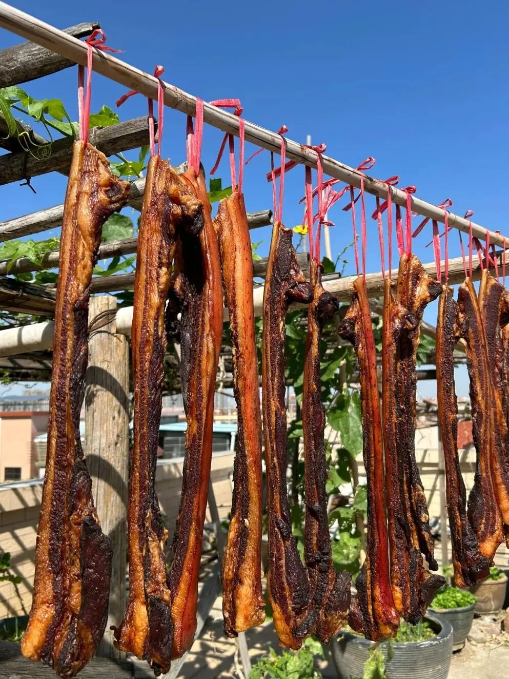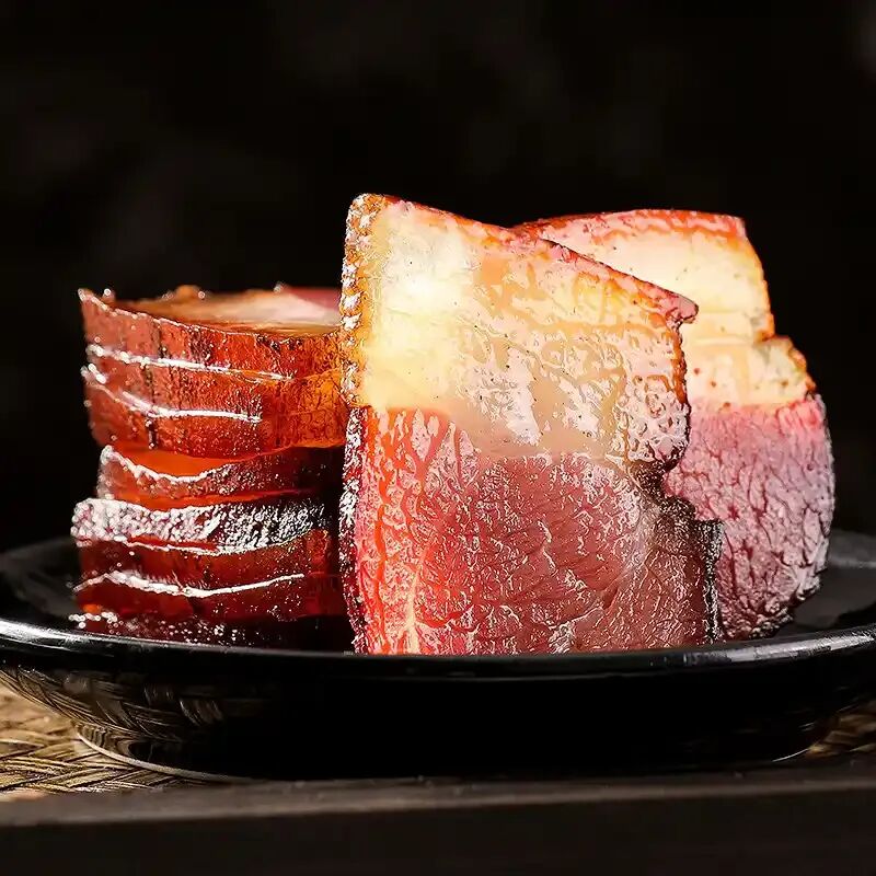 这香,是光阴的慢酿。腌好的肉,被挂在通风的屋檐下,或是专门的熏房里。山风,是天然的鼓风机,带着山林的凉意与清新,日复一日地吹拂着。阳光,透过窗棂,在肉上投下斑驳的光影,像是时间的指针。烟熏,则是这香气的灵魂。松枝、柏叶,这些带着山林气息的燃料,在烤火屋里慢慢燃烧,升腾起袅袅的青烟。这烟,不烈不燥,带着一种温润的、略带苦涩的香气,丝丝缕缕地渗透进肉的深处。日子,就在这烟熏火燎中一天天过去。肉的颜色,由鲜红变为暗红,再转为深沉的酱色;质地,由柔软变得紧实,再由紧实变得富有弹性。这过程,急不得,也慢不得,全凭光阴的耐心与山风的默契。