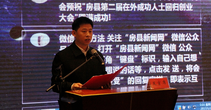 县委书记、县人大常委会主任蔡贤忠在讲话中欢迎各位房县籍的企业家回到家乡,各位企业家从家乡外出打拼时只身一人,带着自己的聪明才智和艰苦拼搏的精神,依靠执着和不到黄河不回头的精神,从零开始打拼出各自的一番事业。各位企业家都是家乡父老乡亲的骄傲,借春节机会,邀请大家一同回家感受家乡的发展变化,共谋房县的明天。举办回归创业大会是响应国家“大众创业、万众创新”号召,也是房县发展和房县人民的需要,更是各位企业家内心的期盼,2016年的第一届大会举行之后,有17位企业家回房县创业回馈家乡,活动要一直办下去、越办越好。