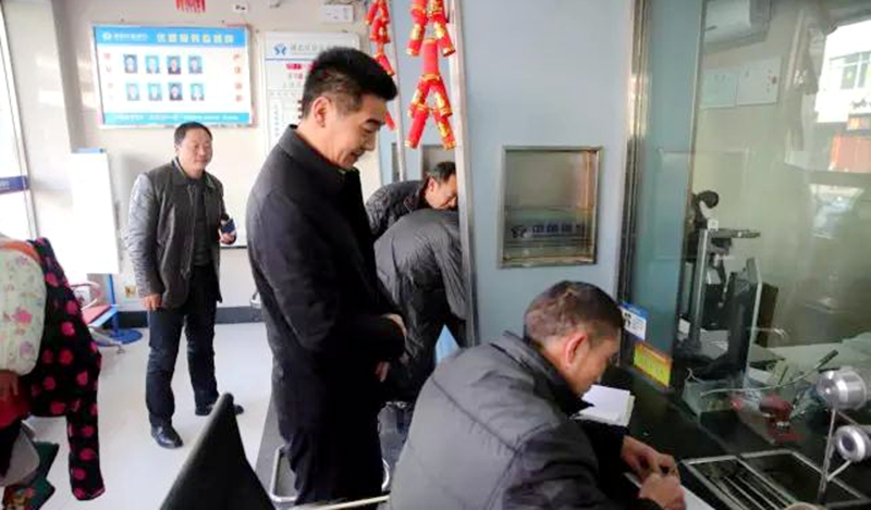 房县农商行董事长刘玉山(中)在大木支行查看“春天行动”活动开展情况