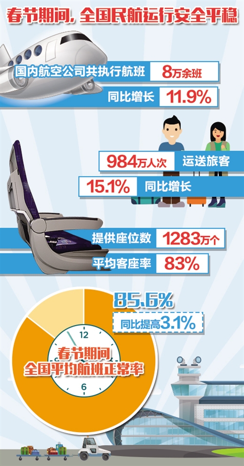 截至2月6日,春运期间我国民航运行安全平稳。值得一提的是,航班正常率有所上升,今年春节黄金周期间全国平均航班正常率85.6%,同比提高3.1%。