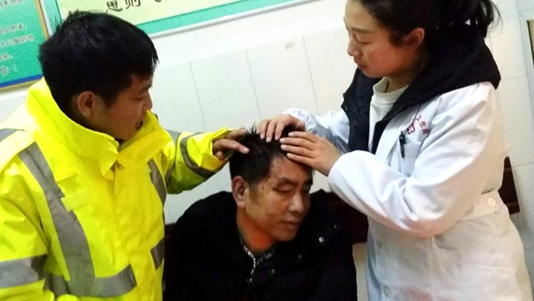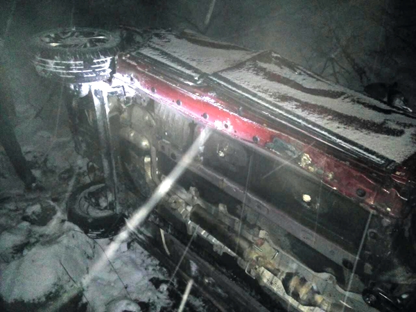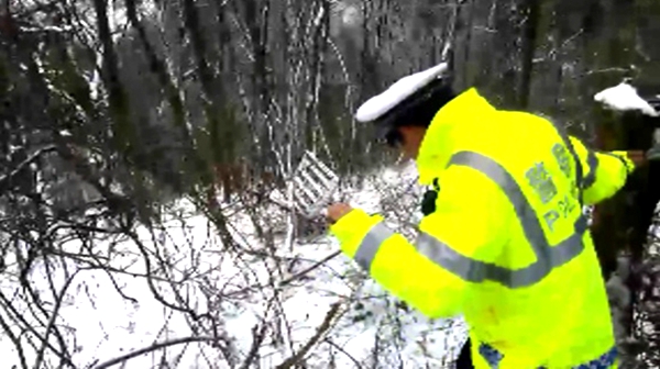 现场位于房县狮九路上龛乡干柴垭峰顶路段,借着车辆的灯光,只见两道深深的轮痕,就是不见车和人的踪迹。民警同救援人员一起打着手电从山顶向山谷展开拉网式搜寻,经过40分钟的摸黑冒雪搜寻,终于在离翻车地点约600米的谷底将车找到。借着微弱的手电光,发现车内有两名受伤人员,头部满是鲜血,经现场呼叫还能说话,民警将二人从车内救出,携同其他人一起将两名伤者背至500米开外的坡下公路,与前来会合的上龛卫生院医护人员一道将伤者送往卫生院救治。