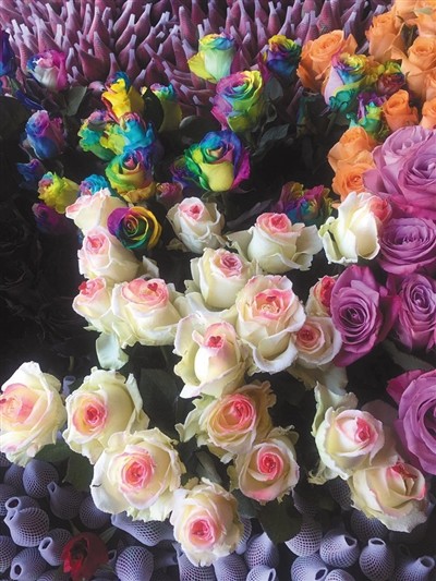 探访发现,部分店员热情推销七彩玫瑰,白雪公主等进口玫瑰。店员介绍,上述花瓣呈七彩色的七彩玫瑰为今年的新品种,天然花。“白雪公主”则经过特殊处理,可长期保鲜不掉色。