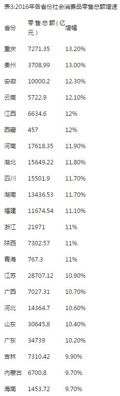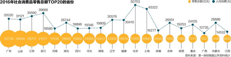 国家统计局的数据显示,2016年,社会消费品零售总额突破33万亿元,达到332316.3亿元,比上年名义增长10.4%。根据第一财经记者统计,共有17个省份的增速高于10.4%的全国平均水平。