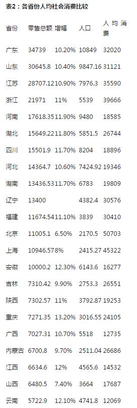 在衡量经济发达程度的重要指标——人均社会消费方面,有12个省份超过了24175元的全国平均水平,有9个省份的人均消费突破了3万元大关。