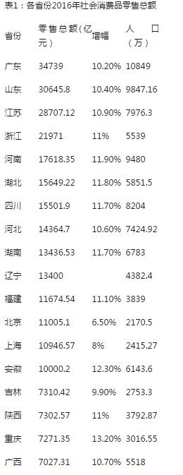 需要说明的是,由于黑龙江未有2016年的公开数据,因此在此没有纳入统计。不过,参考2015年的数据,黑龙江省社会消费品零售总额实现7640.2亿元,则黑龙江消费总量大致位居全国第15位。此外,各省份的人口数据,采用的是2015年各省份统计公报中的数据。