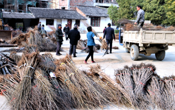 正是植树好光景,军店镇政府购回樱桃、石榴、蜜桃、柿子等果树苗3万余株,分发到相关村,组织村民,抓紧栽植。