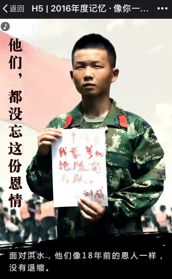 现代快报和中国军视网正是以这个新闻大事件为背景,经过三个多月的精心制作和打磨,一条H5+MV的创新融媒体作品《2016年度记忆?像你一样的你》,于2016年12月30日发布。短短半个多月,这则融媒体产品的阅读量超过600万次,在线为抗洪战士佩戴勋章的网友超过100万次。