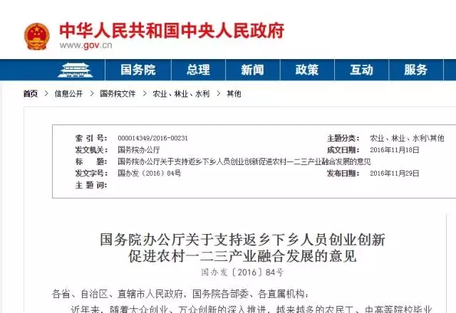不久前,国务院印发了《关于支持返乡下乡人员创业创新促进农村一二三产业融合发展的意见》。