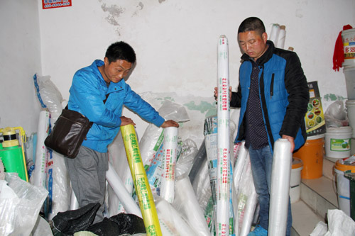青峰镇村卧牛观村村民陈务军和同伴一起在农资专卖店购买地膜。