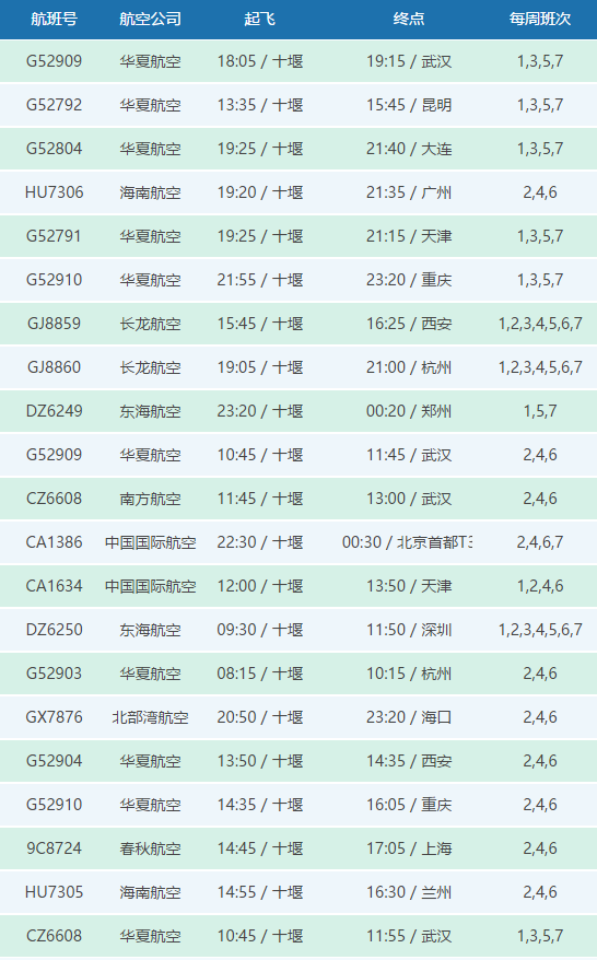北京(南苑)—十堰—广州航线定于3月26日开通,由中国联合航空公司执飞,每周4班(1/3/5/7)。8:00南苑起飞,10:10抵达武当山机场,10:50从武当山机场起飞,13:00到达广州。16:45广州起飞,18:45抵达武当山机场,19:35从武当山机场起飞,21:30到达南苑。