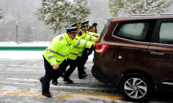 上午10时,笔者在209国道解放坡路段看到,由于受高海拔地区影响,解放坡路段积雪最厚深度达到40厘米,路面太滑车辆难以爬行,一辆大货车已经侧滑横在路中间,占据了两条行车道,情况十分危险。房县公路局养护、路政职工赶紧对沿途道路进行了紧急封闭,同时立即布置现场,设置警示装置,开辟出安全车道,然后又用铁锹铲除受阻车辆轮胎下面的积雪,撒上融雪剂,抛洒防滑料,解救被困车辆。经过两小时的艰苦奋战,12时许,209国道解放破路段回复通行。
