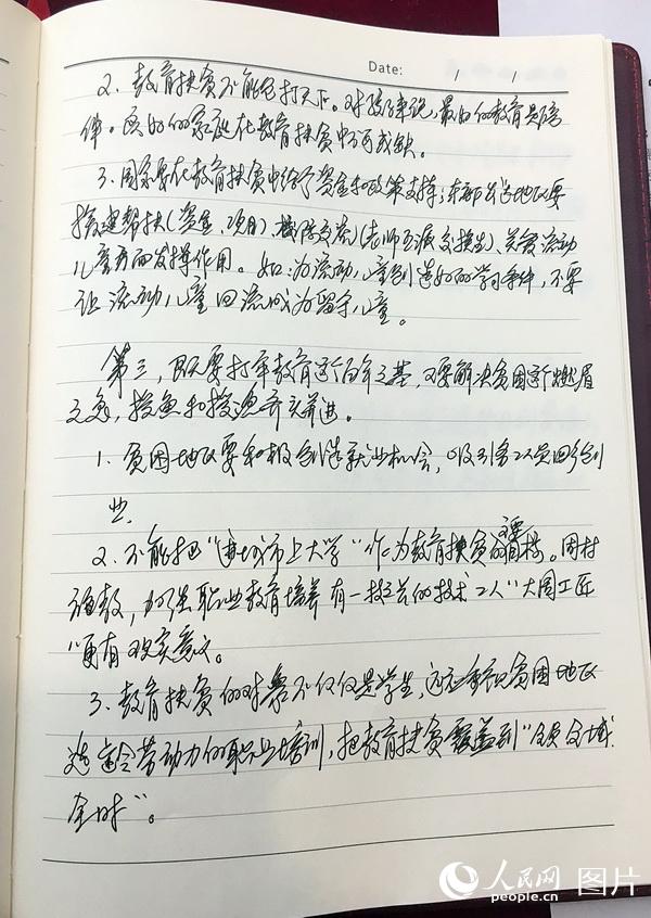 这是全国政协委员何友的参会笔记。何友委员是海军航空工程学院原院长,他关注的是教育扶贫,他在笔记上写到“教育帮扶不能包打天下,对孩子来说,最好的教育是陪伴,良好的家庭在教育扶贫中不可或缺。”人民网记者 罗旭 摄