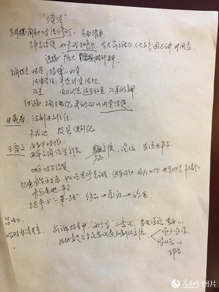 这是全国政协委员张宁的参会笔记。张宁委员是一名台籍委员,他的笔记写满了委员们小组发言的重点。人民网记者 罗旭 摄