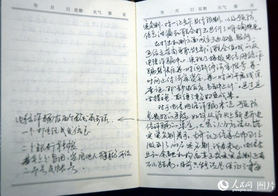 这是全国人大代表周俊军的参会笔记。周俊军是江西省瑞昌市公安局赛湖派出所教导员,他的笔记上写满了如何预防电信网络诈骗的谏言。其中有一页写到“对于电信网络诈骗俩说预防是最好的手段,如何从源头斩断电信诈骗的渠道,大家认为应该从落实实名制着手”。他特意在“预防是最好的手段”后面用引线勾出电信诈骗的特点和步骤。人民网记者 秦海峰 摄