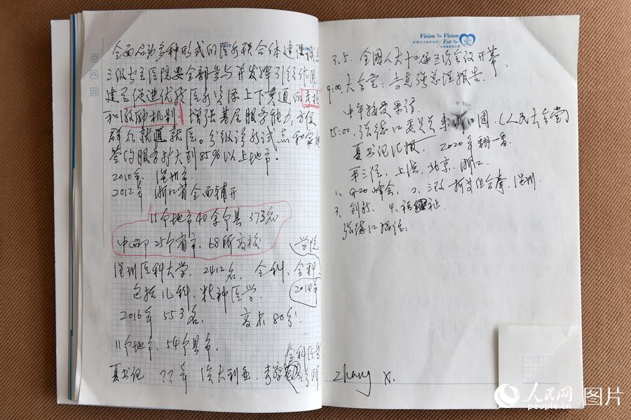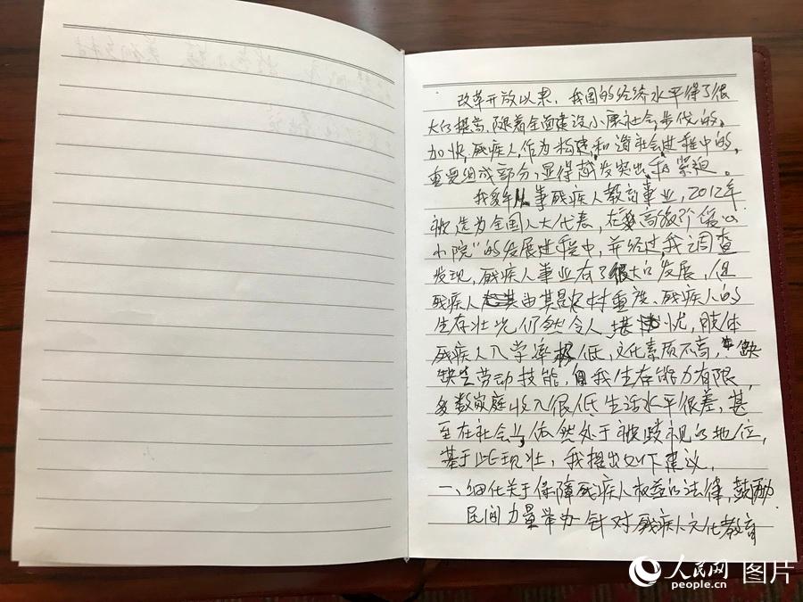 这是全国人大代表高淑珍的两会笔记。高淑珍代表是来自河北唐山的一名基层代表,她从事残疾人教育工作,创办了收留残疾儿童的“爱心小院”备受社会关注。高淑珍代表关注的是残疾人教育领域。她在笔记中讲到“农村的残疾人生存状况仍然令人担忧,教育和生存问题都有着极大的问题。”人民网记者 韩雅菘 摄