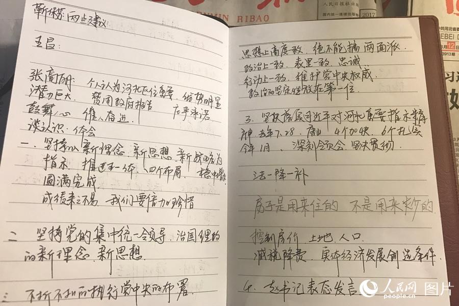 这是全国人大代表冷继英的参会笔记。冷继英代表是河北邯郸广平县第三中学的校长,她在笔记中整齐的写到“不折不扣的执行党中央的布置,思想上高度一致,绝不能搞两面派。政治上一致,表里一致,忠诚。行动上一致,维护党中央权威。政治的坚定性放在第一位。”人民网记者 韩雅菘 摄