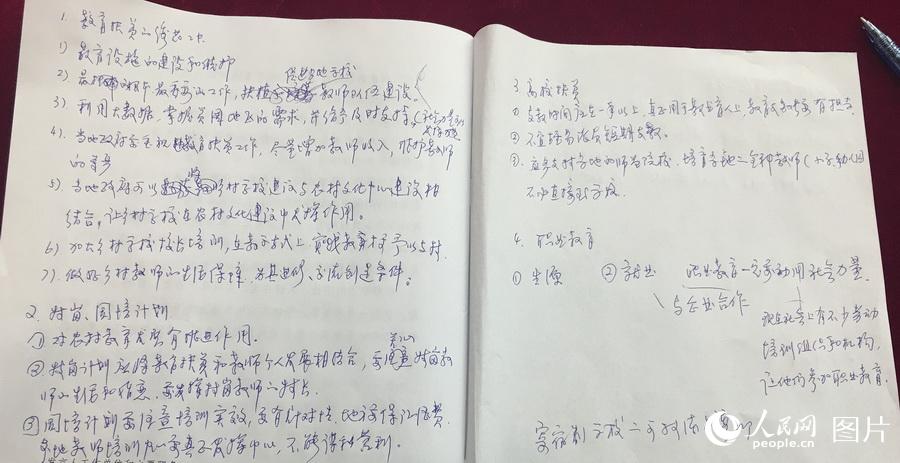 这是全国政协委员章义和的参会笔记。章义和委员是华东师范大学历史系教授,他关注的是教育扶贫问题,他的笔上写到要“利用大数据掌握贫困地区的需求,并给予及时支持。当地政府应该重视教育扶贫工作,尽量增加教师的收入维护教师的尊严。”人民网记者 罗旭 摄
