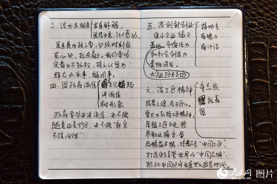 这是全国人大代表李桂杰的参会笔记。李桂杰代表是渤海船舶职业学院基础部教授,她的笔记中写到“政府要带头讲诚信,决不能随意改变约定,决不能‘新官不理旧账’。”人民网记者 翁奇羽 摄