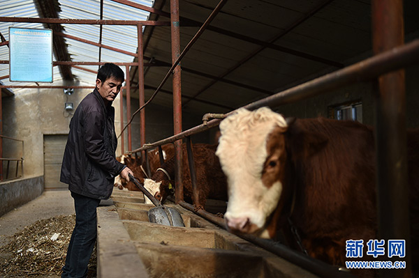 在宁夏固原市原州区头营镇石羊村,马万武给肉牛添加饲草(资料照片)。新华社记者 李然 摄