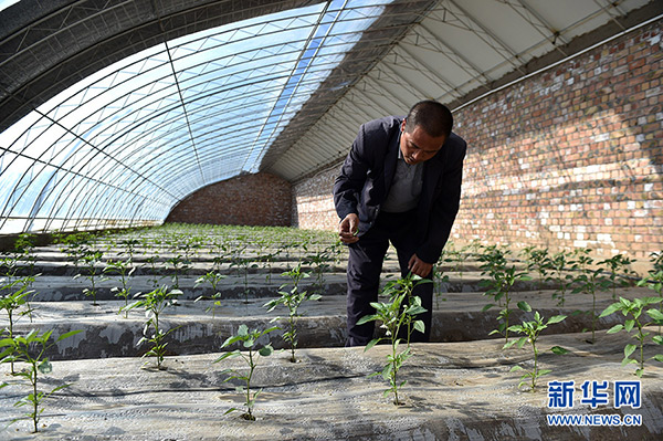 在宁夏西吉县吉强镇套子湾村,农户查看温室大棚里种植的辣椒(资料照片)。新华社记者 李然 摄