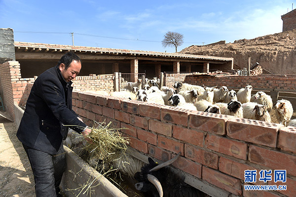 盐池县王乐井乡曾记畔村村民鲁永胜在喂羊(资料照片)。新华社记者 李然 摄